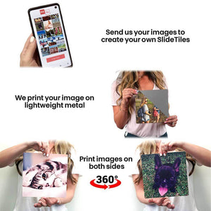 A Slidetile is an 8" x 8" metal print on which we imprint a high quality image. It's not a cheap piece of plastic or foam.